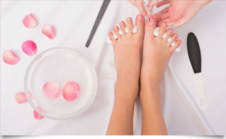 (couper et limer les ongles, enlever la corne, exfolier, hydrater et appliquer un vernis)